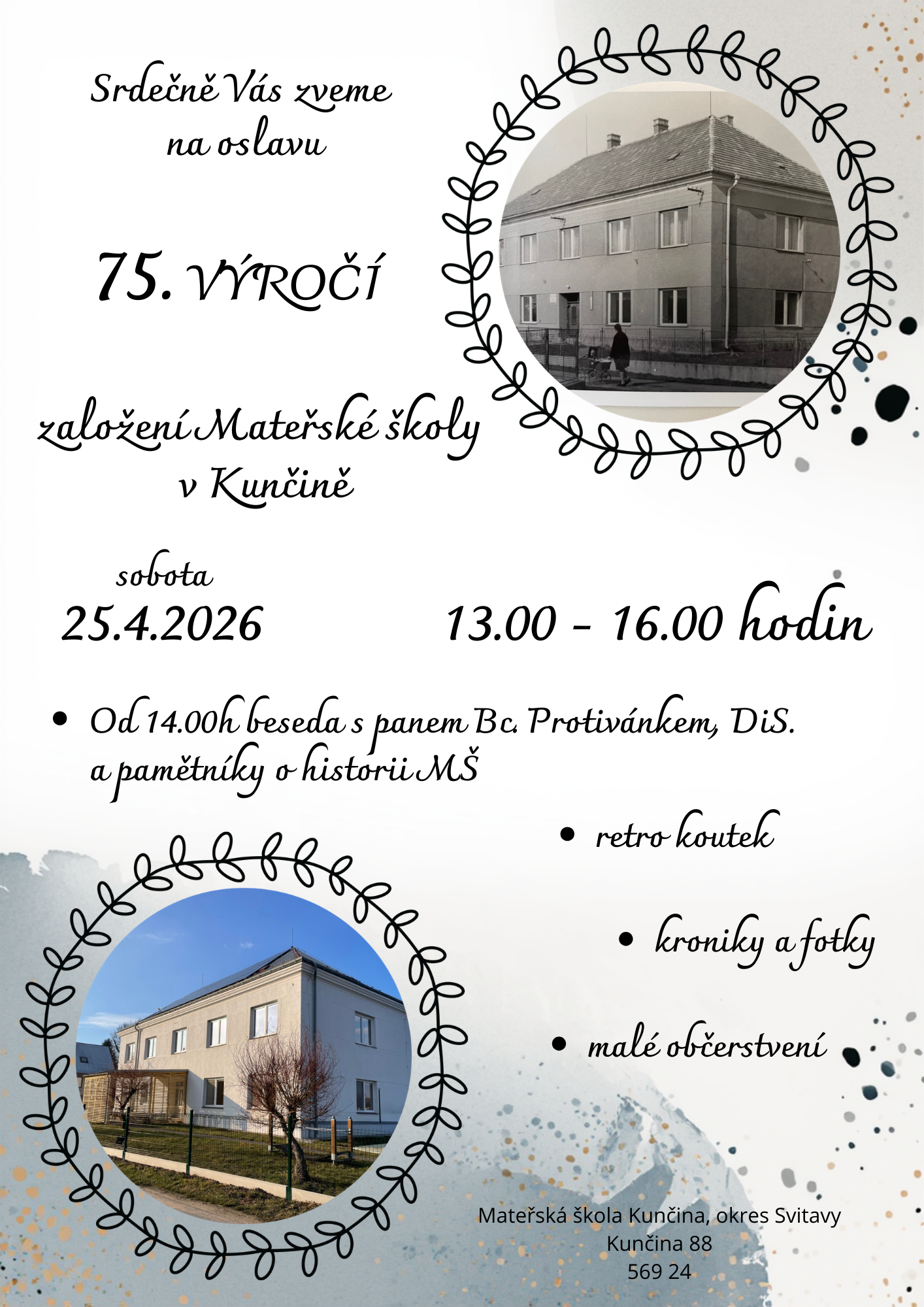 Naše MŠ se nachází v malebné vesničce Kunčina nedaleko města Moravská Třebová. Je příspěvkovou organizací zřizovanou obcí. Tvoří ji dvě pracoviště, z nichž hlavní pracoviště se nachází v samotné obci Kunčina a odloučené pracoviště je umístěno v přidružené obci Nová Ves. V MŠ jsou zřízeny tři věkově heterogenní třídy s celodenním provozem, z nichž dvě jsou umístěny v Mateřské škole v Kunčině a jedna na odloučeném pracovišti v Nové Vsi. Klidné vesnické prostředí a nedaleký les nám skýtají mnoho příležitostí k poznávání přírody i života na vsi, čehož aktivně využíváme při plánování jednotlivých témat ve školním vzdělávacím programu s názvem "PUTUJEME SE SLUNÍČKEM A OBJEVUJEME KUNČINU A OKOLÍ".
