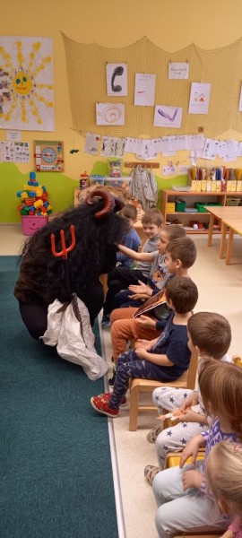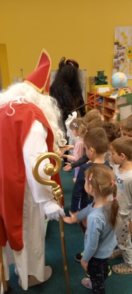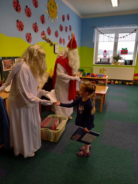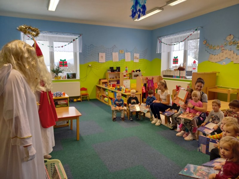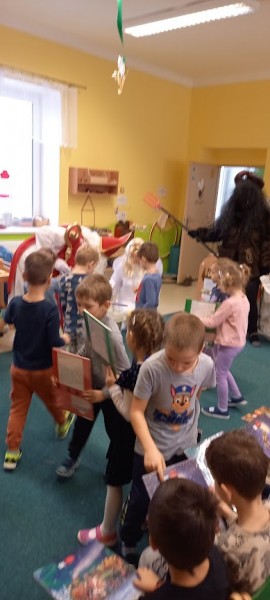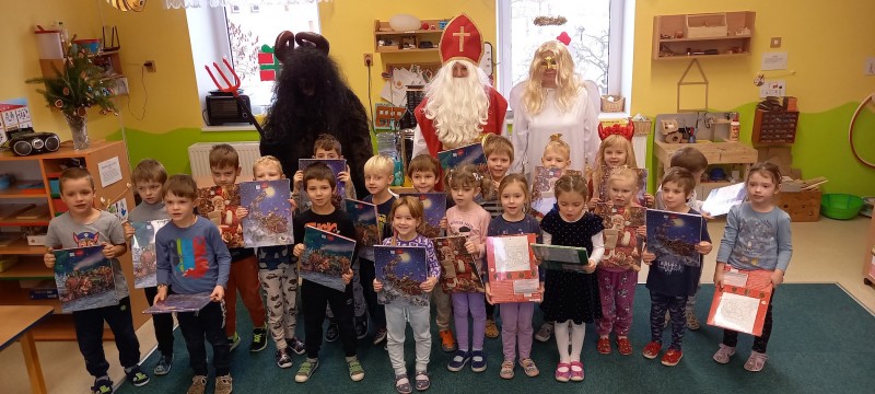 V úterý 5.12.2023 naši školku navštívil Mikuláš se svojí družinou. Celá školka byla na jejich příchod nachystaná. Děti si opakovaly básničky a písníčky, které později řekly Mikulášovi, andělovi a čertovi. Nakonec děti dostaly od Mikuláše adventní kalendáře, za které moc děkujeme p. Knápkovi st.