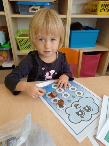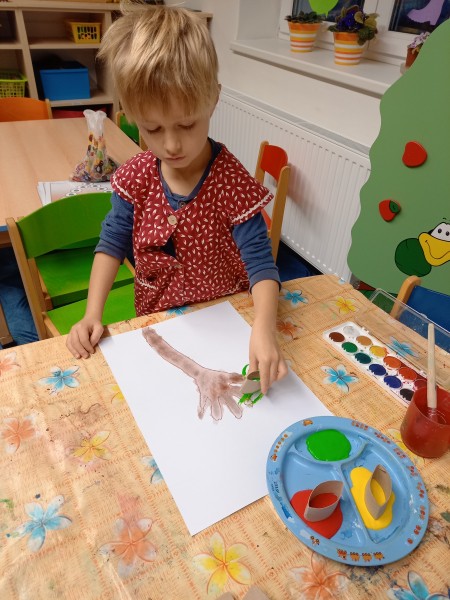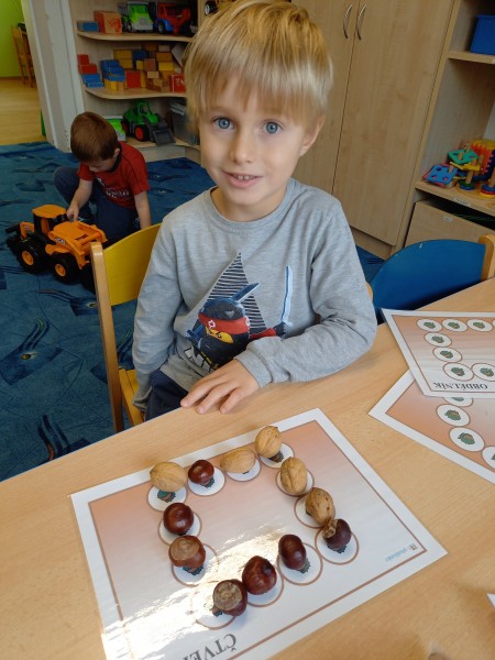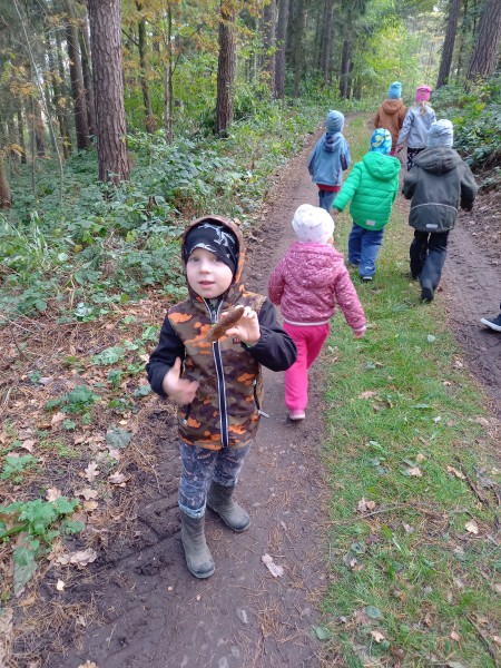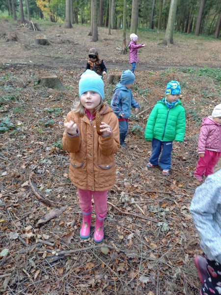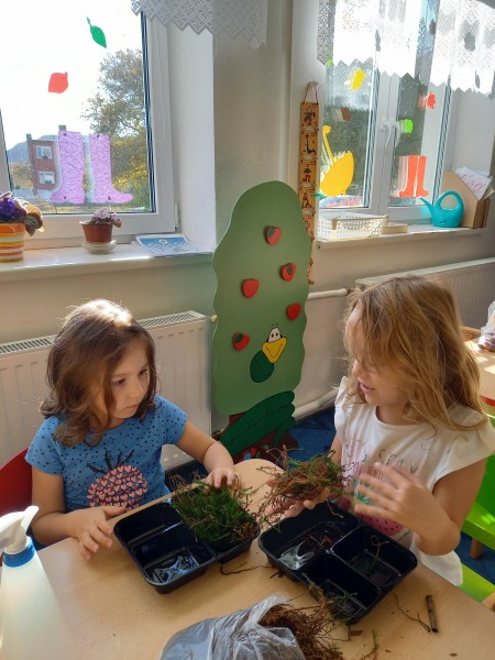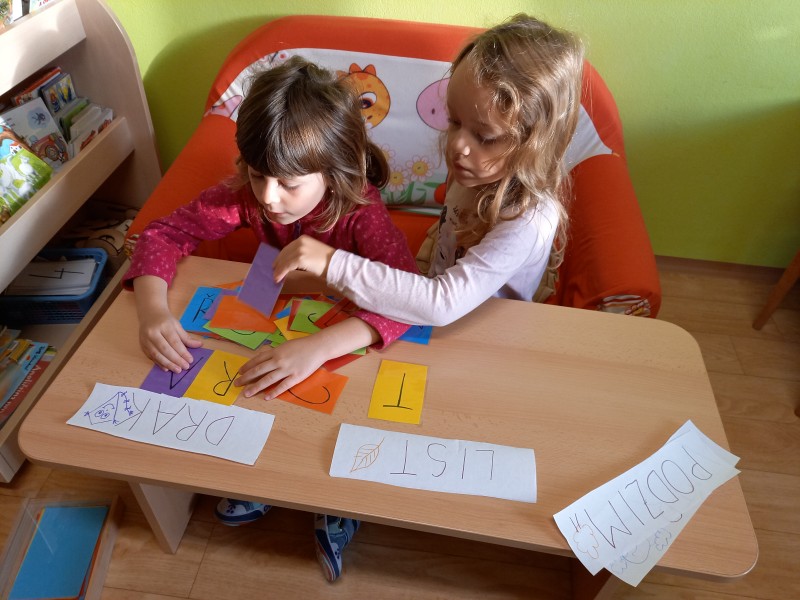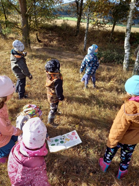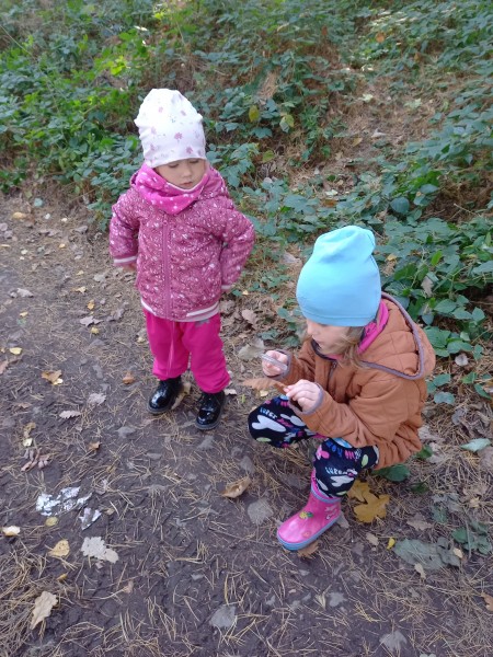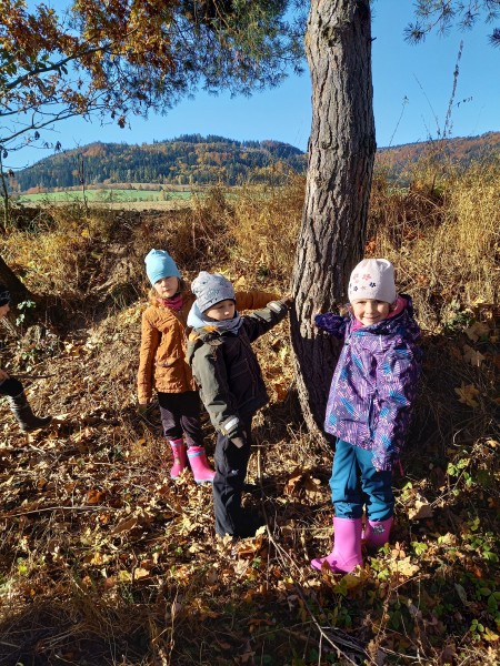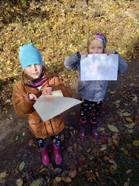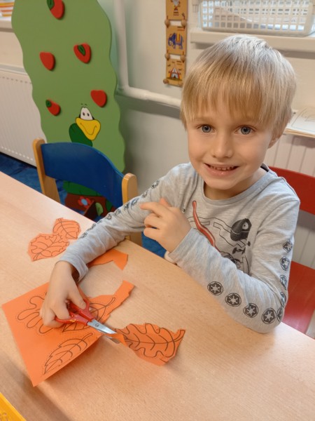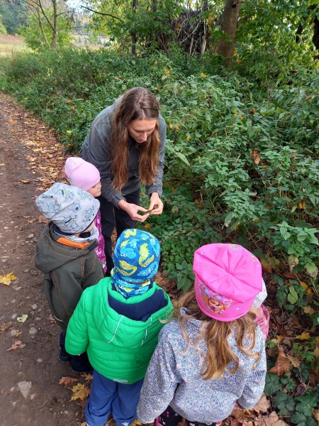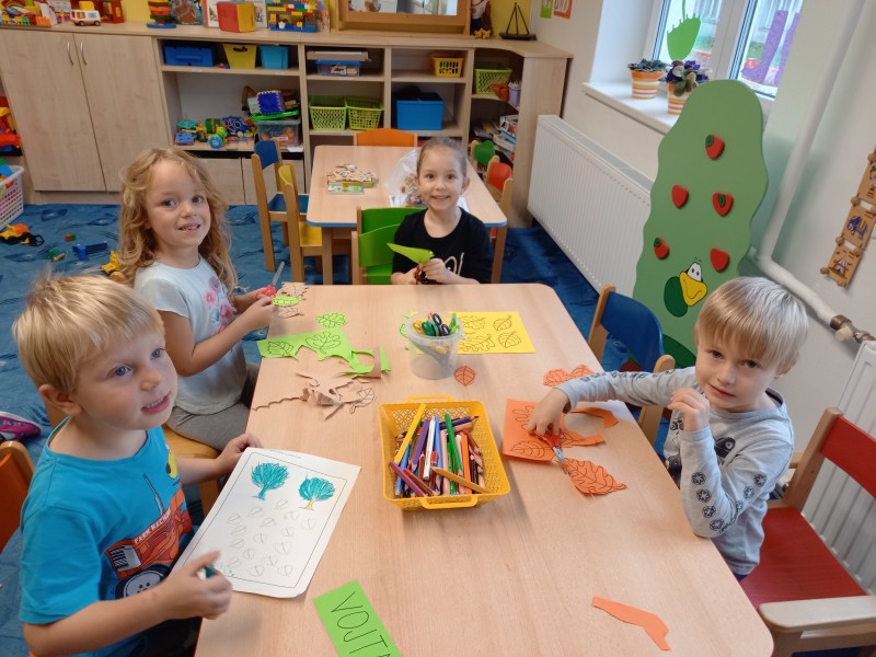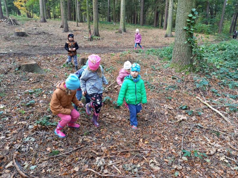 Děti se učily vnímat krásy a barevnosti podzimu, změny v přírodě. Při procházkách do blízkého lesa se seznámily s vybranými druhy přírodnin a podzimními plody. Zkoumaly šišky, kůru, mech, listy a jehličí, které jsme poté ve třídě využily na pokusy a další vzdělávací činnosti. Formou her se děti seznamovaly také se správným oblékáním na podzim. Zpívali jsme písničky o podzimu, využívaly jsme různé hudení nástroje. Děti velmi zaujala výroba a následné použití "oblékacího skřítka", díky němuž zkoumaly podzimní přírodu.